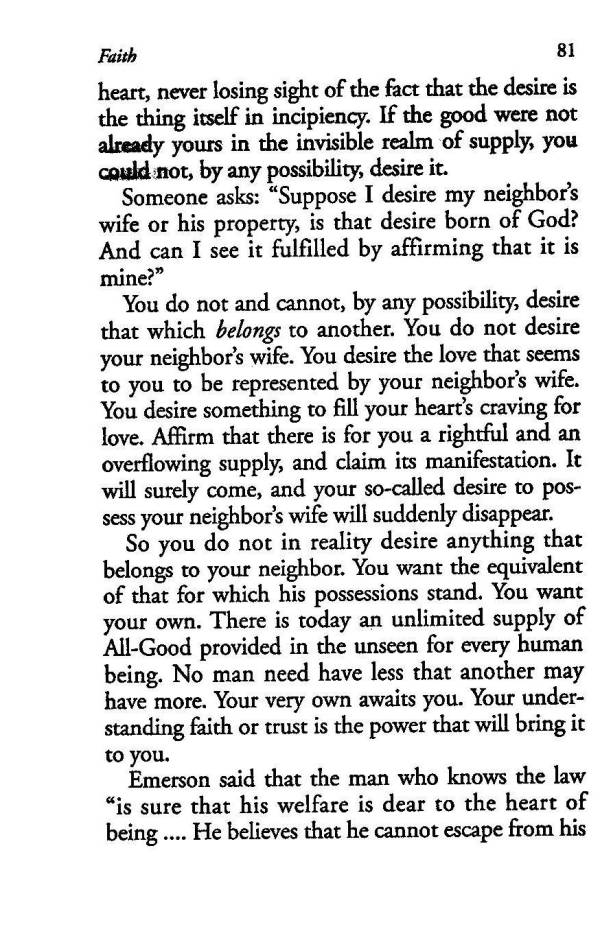 So you do not in reality desire anything that belongs to your neighbor. You want the equivalent of that for which his possessions stand. You want your own. There is today an unlimited supply of All-Good provided in the unseen for every human being. No man need have less that another may have more. Your very own awaits you. Your understanding faith or trust is the power that will bring it to you.