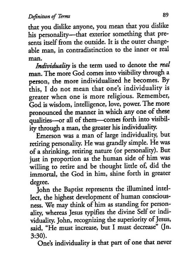 Individuality is the term used to denote the real man. The more God comes into visibility through a person, the more individualized he becomes. By this, I do not mean that one's individuality is greater when one is more religious. Remember, God is wisdom, intelligence, love, power. The more pronounced the manner in which any one of these qualities --- or all of them --- comes forth into visibility through a man, the greater his individuality.