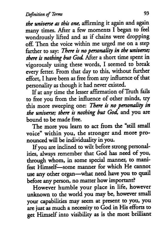 the universe as this one, affirming it again and again many times. After a few moments I began to feel wondrously lifted and as if chains were dropping off. Then the voice within me urged me on a step farther to say: There is no personality in the universe; there is nothing but God. After a short time spent in vigorously using these words, I seemed to break every fetter. From that day to this, without further effort, I have been as free from any influence of that personality as though it had never existed.