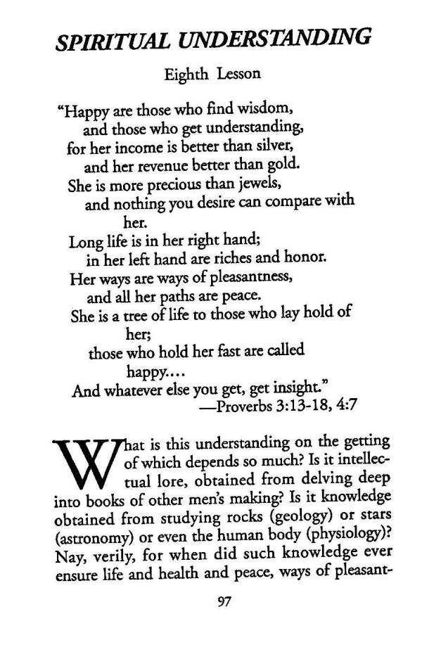 What is this understanding on the getting of which depends so much? Is it intellectual lore, obtained from delving deep into books of other men's making? Is it knowledge obtained from studying rocks (geology) or stars (astronomy) or even the human body (physiology)? Nay, verily, for when did such knowledge ever ensure life and health and peace, ways of pleasantness,