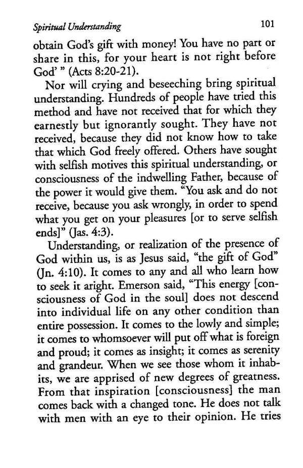 Understanding, or realization of the presence of God within us, is as Jesus said, "the gift of God" (Jn. 4:10). It comes to any and all who learn how to seek it aright. Emerson said, "This energy [consciousness of God in the soul] does not descend into individual life on any other condition than entire possession. It comes to the lowly and simple; it comes to whomsoever will put off what is foreign and proud; it comes as insight; it comes as serenity and grandeur. When we see those whom it inhabits, we are apprised of new degrees of greatness. From that inspiration [consciousness] the man comes back with a changed tone. He does not talk with men with an eye to their opinion. He tries