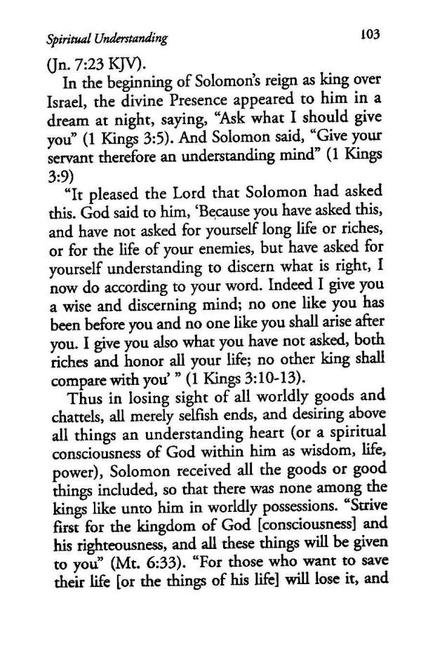 Thus in losing sight of all worldly goods and chattels, all merely selfish ends, and desiring above all things an understanding heart (or a spiritual consciousness of God within him as wisdom, life, power), Solomon received all the goods or good things included, so that there was none among the kings like unto him in worldly possessions. "Strive first for the kingdom of God [consciousness] and his righteousness, and all these things will be given to you" (Mt. 6:33). "For those who want to save their life [or the things of his life] will lose it, and