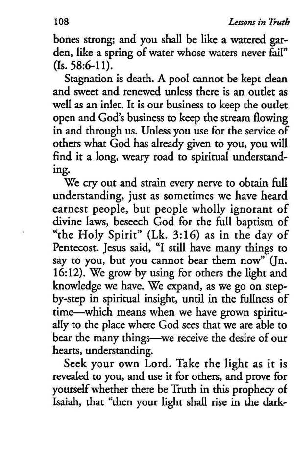 Stagnation is death. A pool cannot be kept clean and sweet and renewed unless there is an outlet as well as an inlet. It is our business to keep the outlet open and God's business to keep the stream flowing in and through us. Unless you use for the service of others what God has already given to you, you will find it a long, weary road to spiritual understanding.