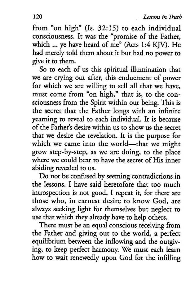 There must be an equal conscious receiving from the Father and giving out to the world, a perfect equilibrium between the inflowing and the outgiving, to keep perfect harmony. We must each learn how to wait renewedly upon God for the infilling