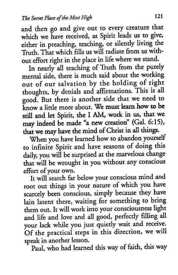 that we may have the mind of Christ in all things. When you have learned how to abandon yourself to infinite Spirit and have seasons of doing this daily, you will be surprised at the marvelous change that will be wrought in you without any conscious effort of your own.