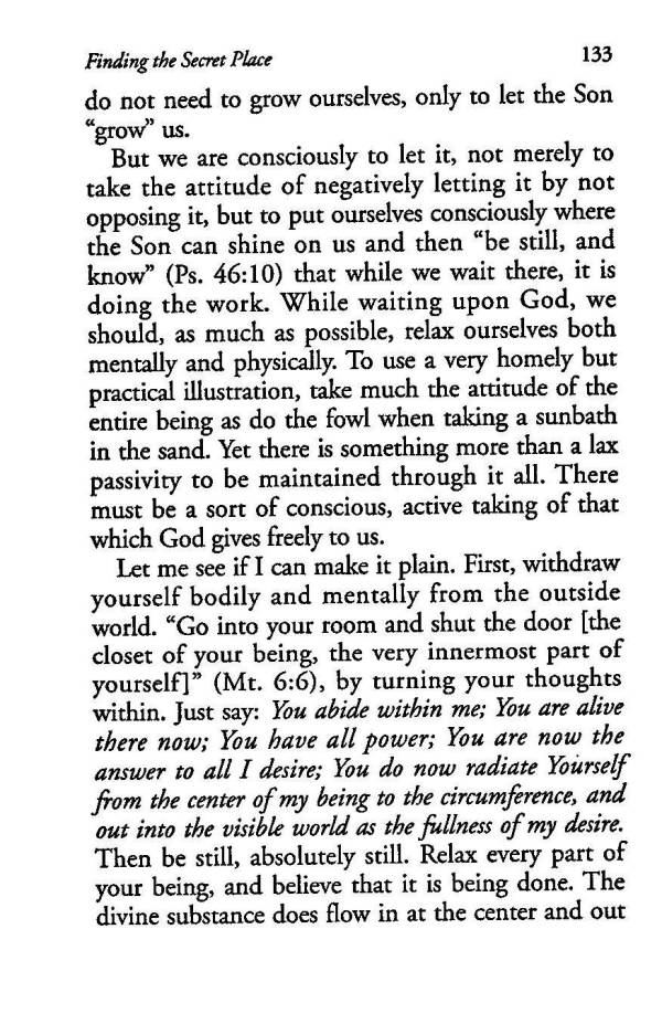 But we are consciously to let it, not merely to take the attitude of negatively letting it by not opposing it, but to put ourselves consciously where the Son can shine on us and then "be still, and know" (Ps. 46:10) that while we wait there, it is doing the work. While waiting upon God, we should, as much as possible, relax ourselves both mentally and physically. To use a very homely but practical illustration, take much the attitude of the entire being as do the fowl when taking a sunbath in the sand. Yet there is something more than a lax passivity to be maintained through it all. There must be a sort of conscious, active taking of that which God gives freely to us.