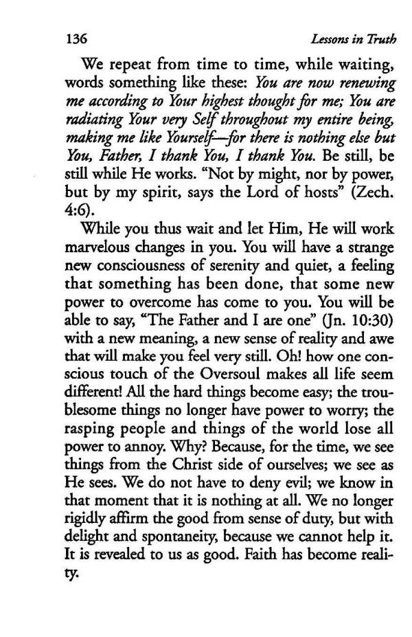 While you thus wait and let Him, He will work marvelous changes in you. You will have a strange new consciousness of serenity and quiet, a feeling that something has been done, that some new power to overcome has come to you. You will be able to say, "The Father and I are one" (Jn. 10:30) with a new meaning, a new sense of reality and awe that will make you feel very still. Oh! how one conscious touch of the Oversoul makes all life seem different! All the hard things become easy; the troublesome things no longer have power to worry; the rasping people and things of the world lose all power to annoy. Why? Because, for the time, we see things from the Christ side of ourselves; we see as He sees. We do not have to deny evil; we know in that moment that it is nothing at all. We no longer rigidly affirm the good from sense of duty, but with delight and spontaneity, because we cannot help it. It is revealed to us as good. Faith has become reality.