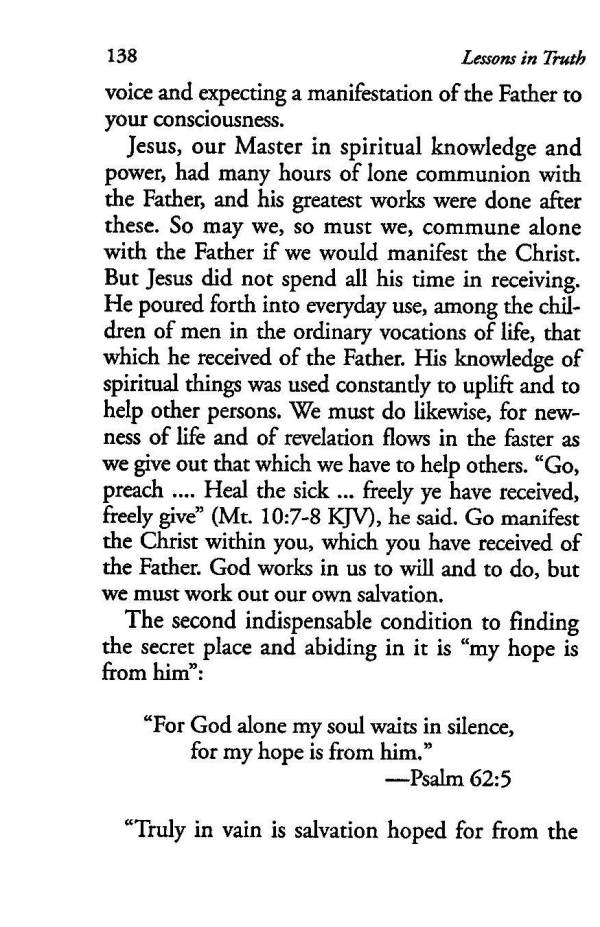Jesus, our Master in spiritual knowledge and power, had many hours of lone communion with the Father, and his greatest works were done after these. So may we, so must we, commune alone with the Father if we would manifest the Christ. But Jesus did not spend all his time in receiving. He poured forth into everyday use, among the children of men in the ordinary vocations of life, that which he received of the Father. His knowledge of spiritual things was used constantly to uplift and to help other persons. We must do likewise, for newness of life and of revelation flows in the faster as we give out that which we have to help others. "Go, preach .... Heal the sick ... freely ye have received, freely give" (Mt. 10:7-8 KJV), he said. Go manifest the Christ within you, which you have received of the Father. God works in us to will and to do, but we must work out our own salvation.