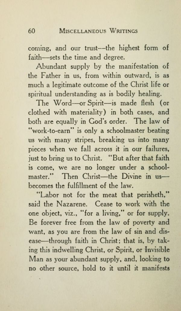 "Labor not for the meat that perisheth," 1 said the Nazarene. Cease to work with the one object, viz., "for a living," or for supply. Be forever free from the law of poverty and want, as you are from the law of sin and disease --- through faith in Christ; that is, by taking this indwelling Christ, or Spirit, or Invisible Man as your abundant supply, and, looking to no other source, hold to it until it manifests