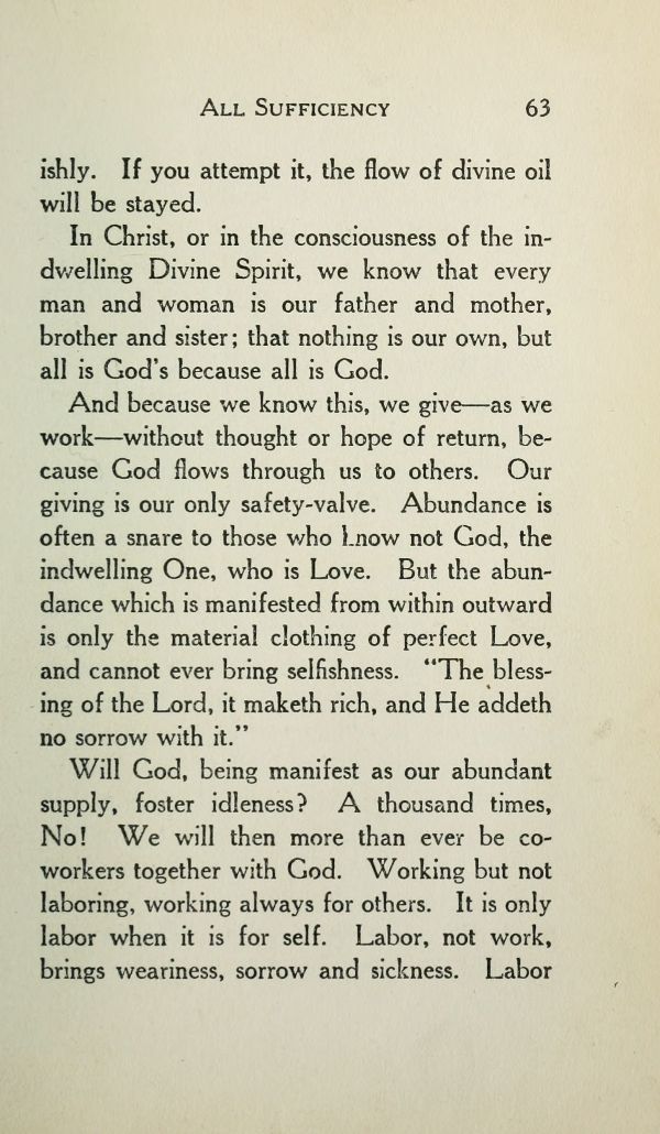 And because we know this, we give --- as we work --- without thought or hope of return, because God flows through us to others. Our giving is our only safety-valve. Abundance is often a snare to those who blow not God, the indwelling One, who is Love. But the abundance which is manifested from within outward is only the material clothing of perfect Love, and cannot ever bring selfishness. "The blessing of the Lord, it maketh rich, and He addeth no sorrow with it."