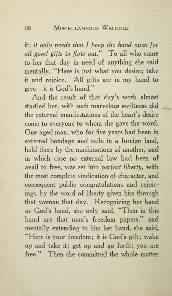 And the result of that day's work almost startled her, with such marvelous swiftness did the external manifestations of the heart's desire come to everyone to whom she gave the word. One aged man, who for five years had been in external bondage and exile in a foreign land, held there by the machinations of another, and in which case no external law had been of avail to free, was set into perfect liberty, with the most complete vindication of character, and consequent public congratulations and rejoicings, by the word of liberty given him through that woman that day. Recognizing her hand as God's hand, she only said, "Then in this hand are that man's freedom papers," and mentally extending to him her hand, she said, "Here is your freedom; it is God's gift; wake up and take it; get up and go forth; you are free." Then she committed the whole matter