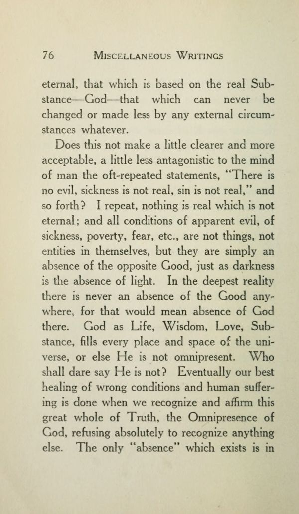 Does this not make a little clearer and more acceptable, a little less antagonistic to the mind of man the oft-repeated statements, "There is no evil, sickness is not real, sin is not real," and so forth? I repeat, nothing is real which is not eternal; and all conditions of apparent evil, of sickness, poverty, fear, etc., are not things, not entities in themselves, but they are simply an absence of the opposite Good, just as darkness is the absence of light. In the deepest reality there is never an absence of the Good anywhere, for that would mean absence of God there. God as Life, Wisdom, Love, Substance, fills every place and space of the universe, or else He is not omnipresent. Who shall dare say He is not? Eventually our best healing of wrong conditions and human suffering is done when we recognize and affirm this great whole of Truth, the Omnipresence of God, refusing absolutely to recognize anything else. The only "absence" which exists is in