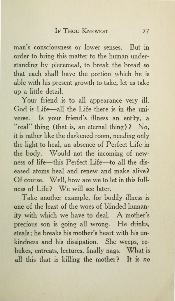 Your friend is to all appearance very ill. God is Life --- all the Life there is in the universe. Is your friend's illness an entity, a "real" thing (that is, an eternal thing)? No, it is rather like the darkened room, needing only the light to heal, an absence of Perfect Life in the body. Would not the incoming of newness of life --- this Perfect Life --- to all the diseased atoms heal and renew and make alive? Of course. Well, how are we to let in this fullness of Life? We will see later.