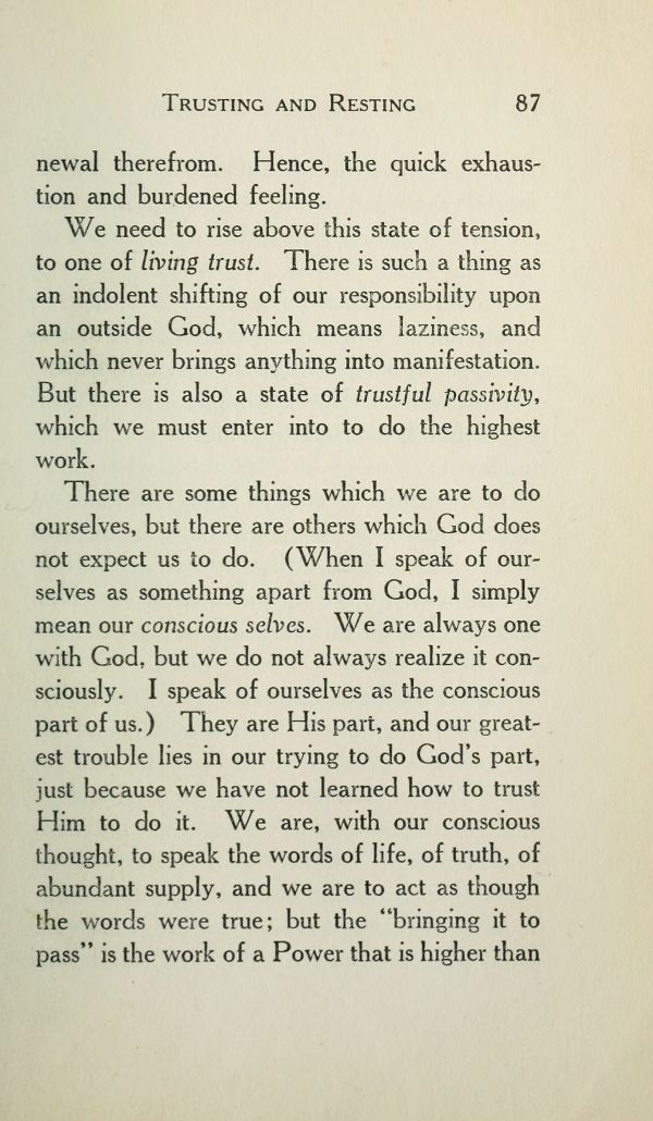 We need to rise above this state of tension, to one of living trust. There is such a thing as an indolent shifting of our responsibility upon an outside God, which means laziness, and which never brings anything into manifestation. But there is also a state of trustful passivity, which we must enter into to do the highest work.