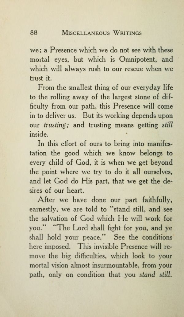 From the smallest thing of our everyday life to the rolling away of the largest stone of difficulty from our path, this Presence will come in to deliver us. But its working depends upon our trusting; and trusting means getting still inside.
