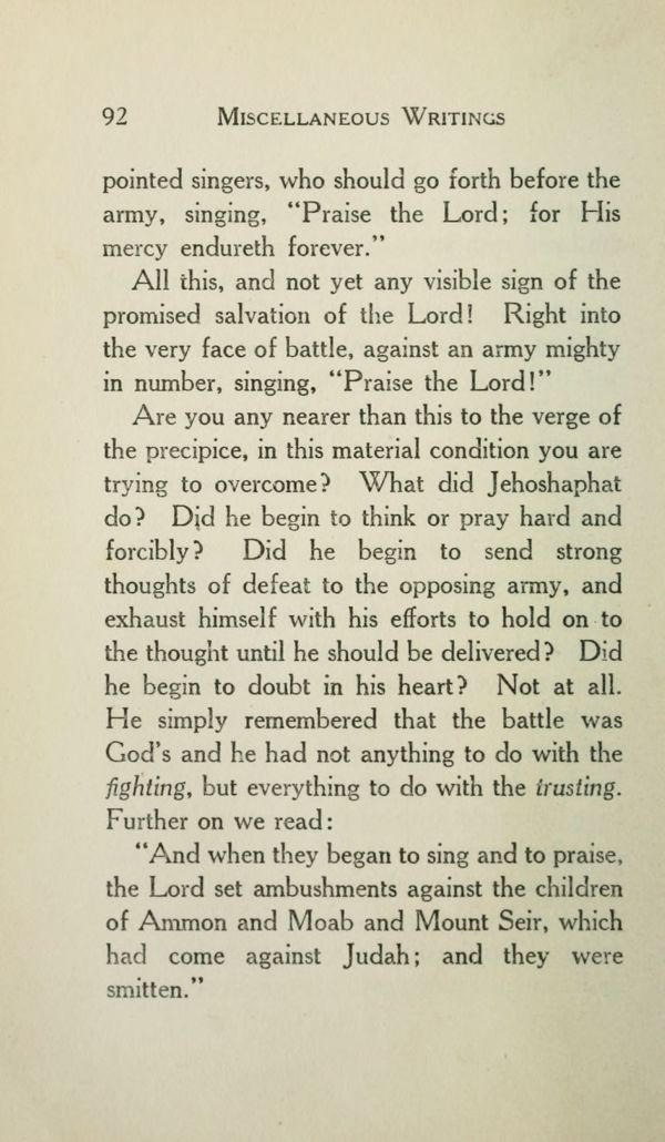 Are you any nearer than this to the verge of the precipice, in this material condition you are trying to overcome? What did Jehoshaphat do? Did he begin to think or pray hard and forcibly? Did he begin to send strong thoughts of defeat to the opposing army, and exhaust himself with his efforts to hold on to the thought until he should be delivered? Did he begin to doubt in his heart? Not at all. He simply remembered that the battle was God's and he had not anything to do with the fighting, but everything to do with the trusting. Further on we read: