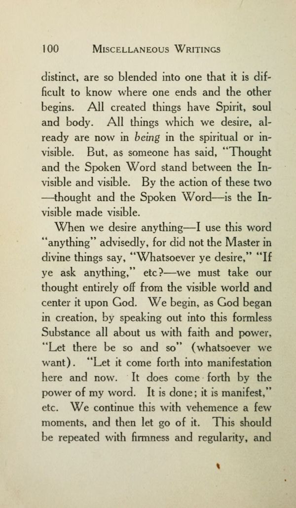 distinct, are so blended into one that it is difficult to know where one ends and the other begins. All created things have Spirit, soul and body. All things which we desire, already are now in being in the spiritual or invisible. But, as someone has said, "Thought and the Spoken Word stand between the Invisible and visible. By the action of these two --- thought and the Spoken Word --- is the Invisible made visible.