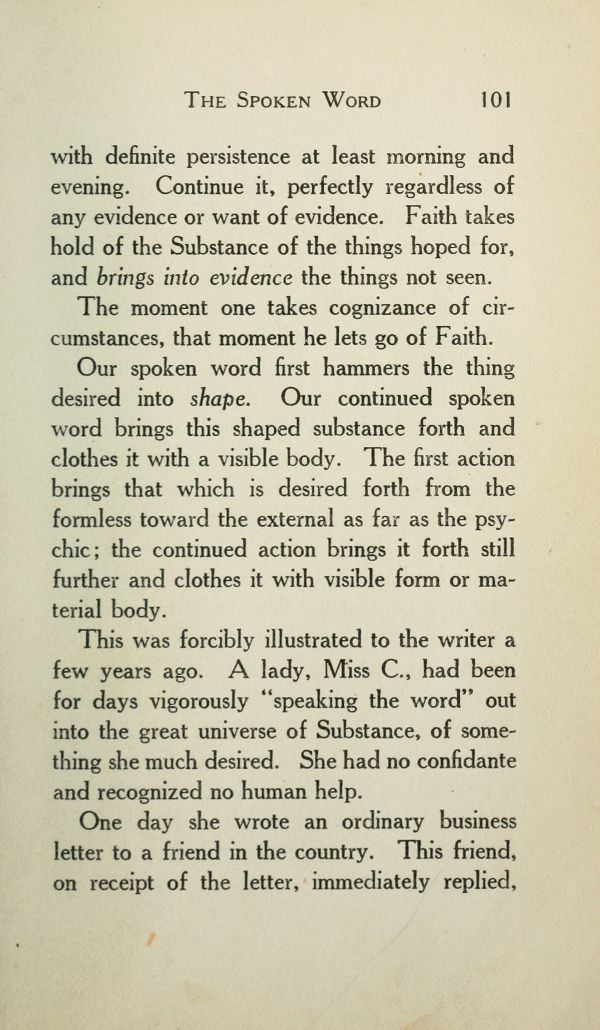 Our spoken word first hammers the thing desired into shape. Our continued spoken word brings this shaped substance forth and clothes it with a visible body. The first action brings that which is desired forth from the formless toward the external as far as the psychic; the continued action brings it forth still further and clothes it with visible form or material body.