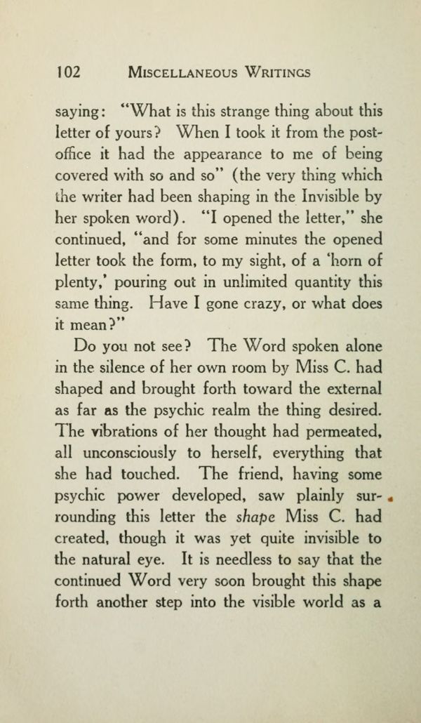 saying: "What is this strange thing about this letter of yours? When I took it from the post office it had the appearance to me of being covered with so and so" (the very thing which the writer had been shaping in the Invisible by her spoken word). "I opened the letter," she continued, "and for some minutes the opened letter took the form, to my sight, of a 'horn of plenty,' pouring out in unlimited quantity this same thing. Have I gone crazy, or what does it mean?"
