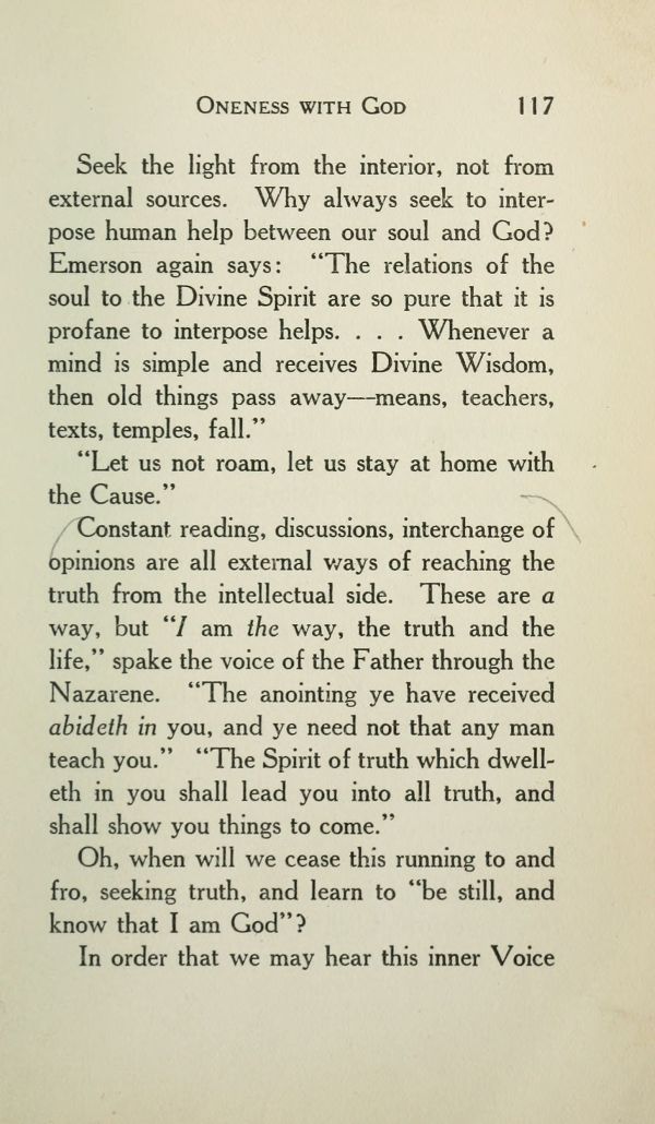 Seek the light from the interior, not from external sources. Why always seek to interpose human help between our soul and God? Emerson again says: "The relations of the soul to the Divine Spirit are so pure that it is profane to interpose helps. . . . Whenever a mind is simple and receives Divine Wisdom, then old things pass away --- means, teachers, texts, temples, fall."