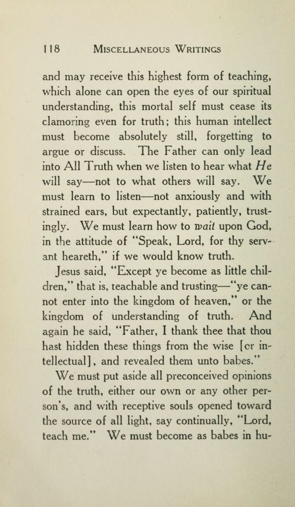 We must put aside all preconceived opinions of the truth, either our own or any other person's, and with receptive souls opened toward the source of all light, say continually, "Lord, teach me." We must become as babes in human