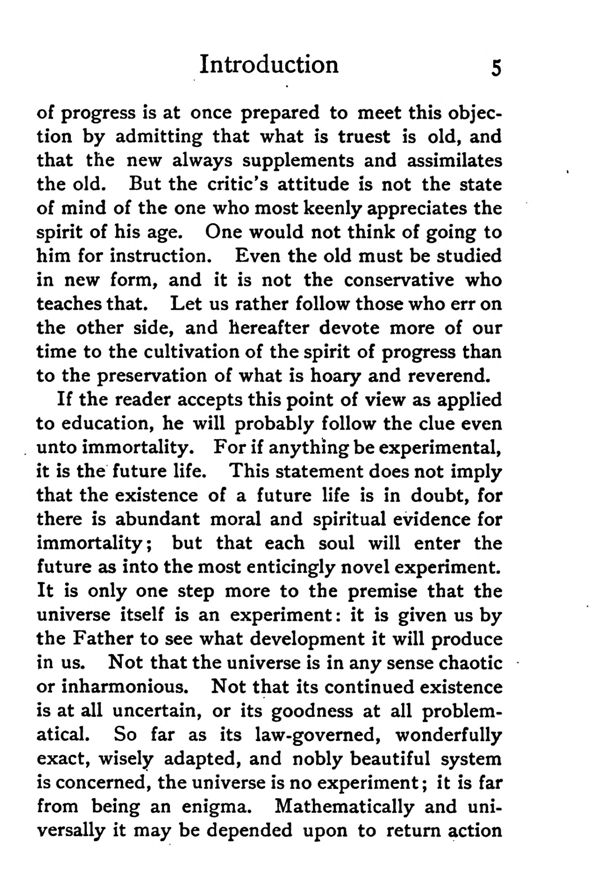 If the reader accepts this point of view as applied to education, he will probably follow the clue even unto immortality. For if anything be experimental, it is the future life. This statement does not imply that the existence of a future life is in doubt, for there is abundant moral and spiritual evidence for immortality; but that each soul will enter the future as into the most enticingly novel experiment. It is only one step more to the premise that the universe itself is an experiment: it is given us by the Father to see what development it will produce in us. Not that the universe is in any sense chaotic or inharmonious. Not that its continued existence is at all uncertain, or its goodness at all problematical. So far as its law-governed, wonderfully exact, wisely adapted, and nobly beautiful system is concerned, the universe is no experiment; it is far from being an enigma. Mathematically and universally it may be depended upon to return action
