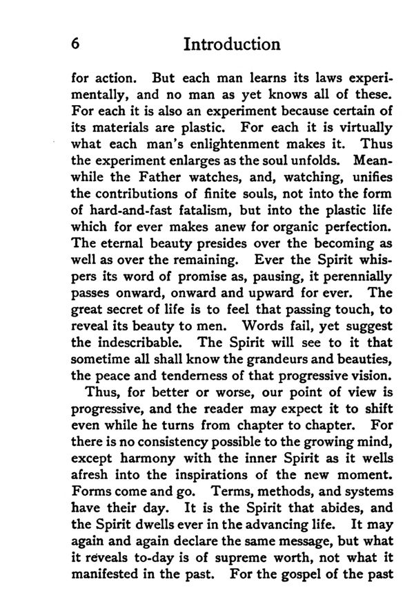 Thus, for better or worse, our point of view is progressive, and the reader may expect it to shift even while he turns from chapter to chapter. For there is no consistency possible to the growing mind, except harmony with the inner Spirit as it wells afresh into the inspirations of the new moment. Forms come and go. Terms, methods, and systems have their day. It is the Spirit that abides, and the Spirit dwells ever in the advancing life. It may again and again declare the same message, but what it reveals to-day is of supreme worth, not what it manifested in the past. For the gospel of the past