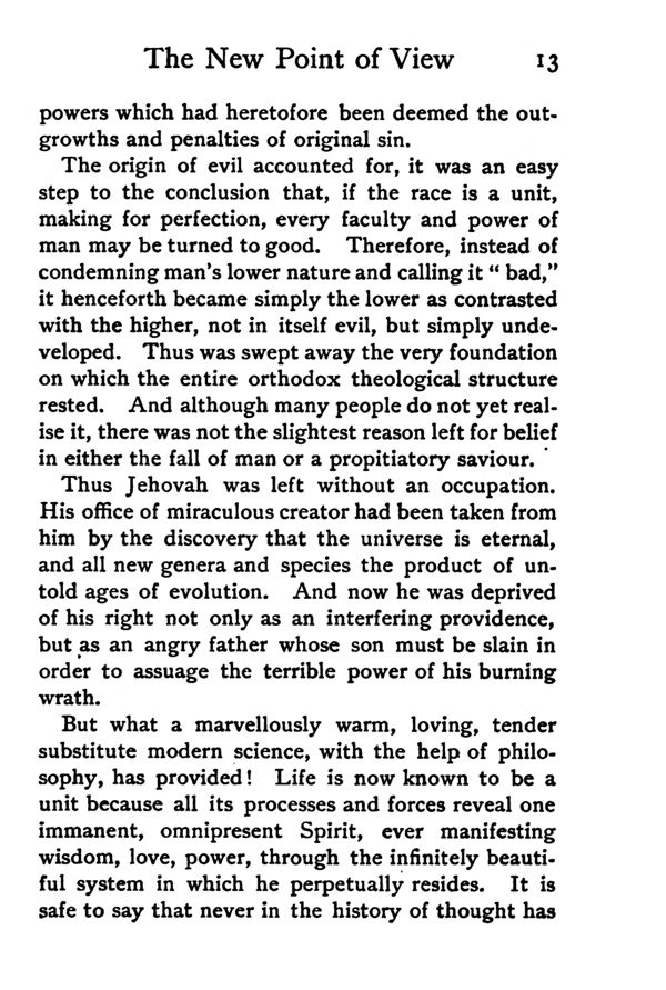 The origin of evil accounted for, it was an easy step to the conclusion that, if the race is a unit, making for perfection, every faculty and power of man may be turned to good. Therefore, instead of condemning man's lower nature and calling it "bad," it henceforth became simply the lower as contrasted with the higher, not in itself evil, but simply undeveloped. Thus was swept away the very foundation on which the entire orthodox theological structure rested. And although many people do not yet realise it, there was not the slightest reason left for belief in either the fall of man or a propitiatory saviour.