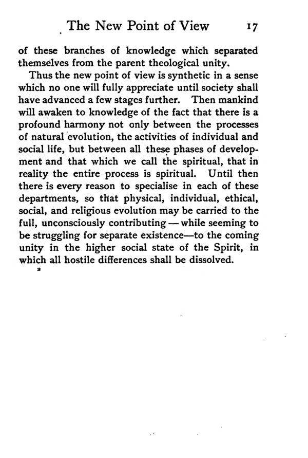 Thus the new point of view is synthetic in a sense which no one will fully appreciate until society shall have advanced a few stages further. Then mankind will awaken to knowledge of the fact that there is a profound harmony not only between the processes of natural evolution, the activities of individual and social life, but between all these phases of development and that which we call the spiritual, that in reality the entire process is spiritual. Until then there is every reason to specialise in each of these departments, so that physical, individual, ethical, social, and religious evolution may be carried to the full, unconsciously contributing — while seeming to be struggling for separate existence—to the coming unity in the higher social state of the Spirit, in which all hostile differences shall be dissolved.