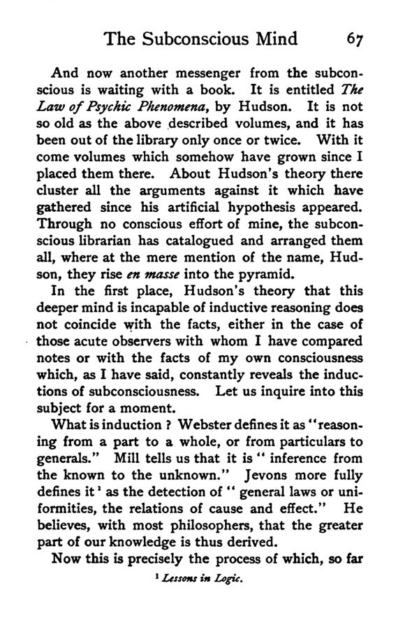 In the first place, Hudson's theory that this deeper mind is incapable of inductive reasoning does not coincide with the facts, either in the case of those acute observers with whom I have compared notes or with the facts of my own consciousness which, as I have said, constantly reveals the inductions of subconsciousness. Let as inquire into this subject for a moment.