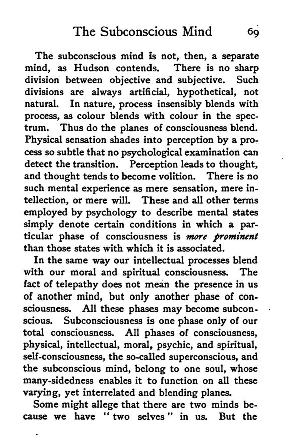 The subconscious mind is not, then, a separate mind, as Hudson contends. There is no sharp division between objective and subjective. Such divisions are always artificial, hypothetical, not natural. In nature, process insensibly blends with process, as colour blends with colour in the spectrum. Thus do the planes of consciousness blend. Physical sensation shades into perception by a process so subtle that no psychological examination can detect the transition. Perception leads to thought, and thought tends to become volition. There is no such mental experience as mere sensation, mere intellection, or mere will. These and all other terms employed by psychology to describe mental states simply denote certain conditions in which a particular phase of consciousness is more prominent than those states with which it is associated.
