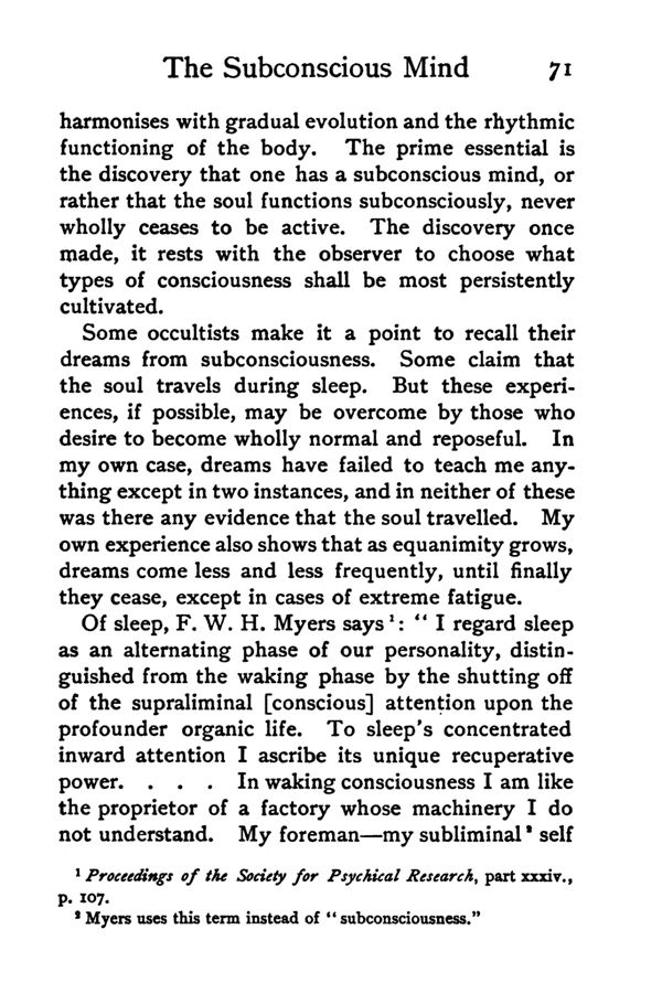harmonises with gradual evolution and the rhythmic functioning of the body. The prime essential is the discovery that one has a subconscious mind, or rather that the soul functions subconsciously, never wholly ceases to be active. The discovery once made, it rests with the observer to choose what types of consciousness shall be most persistently cultivated.