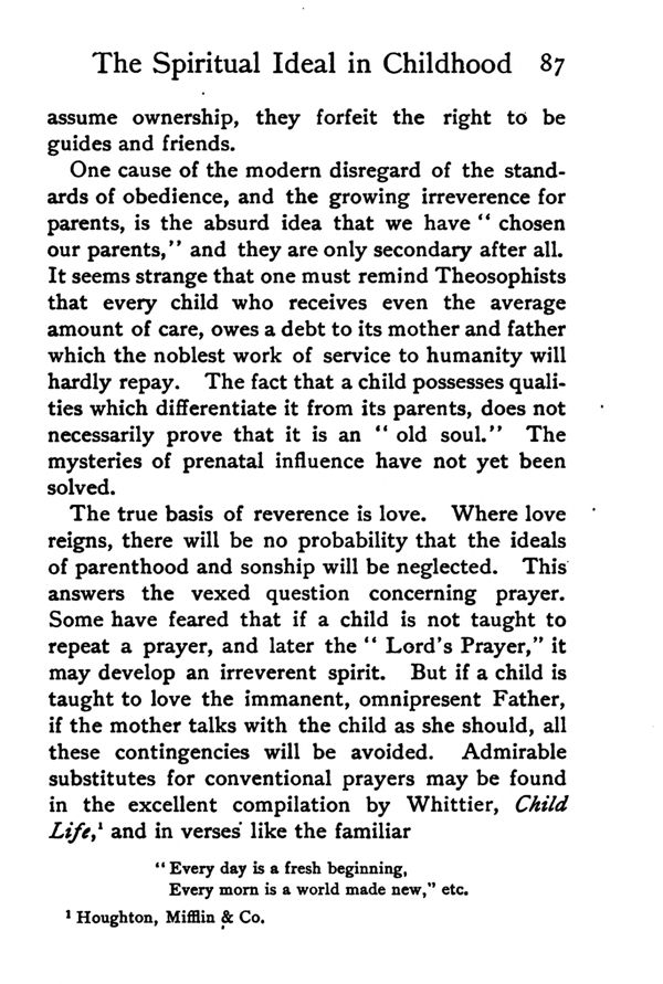 The true basis of reverence is love. Where love reigns, there will be no probability that the ideals of parenthood and sonship will be neglected. This answers the vexed question concerning prayer. Some have feared that if a child is not taught to repeat a prayer, and later the " Lord's Prayer," it may develop an irreverent spirit. But if a child is taught to love the immanent, omnipresent Father, if the mother talks with the child as she should, all these contingencies will be avoided. Admirable substitutes for conventional prayers may be found in the excellent compilation by Whittier, Child Life,1 and in verses like the familiar