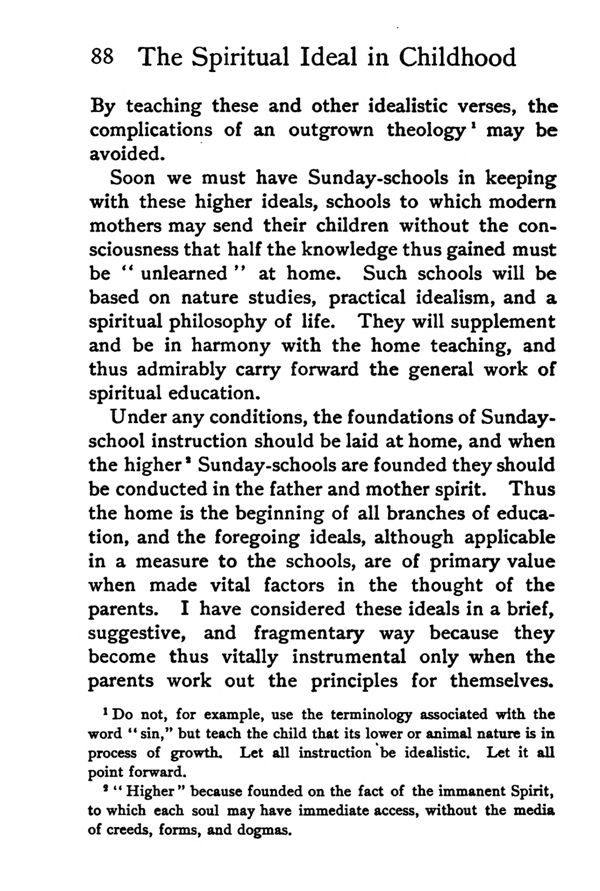 Under any conditions, the foundations of Sunday school instruction should be laid at home, and when the higher2 Sunday-schools are founded they should be conducted in the father and mother spirit. Thus the home is the beginning of all branches of education, and the foregoing ideals, although applicable in a measure to the schools, are of primary value when made vital factors in the thought of the parents. I have considered these ideals in a brief, suggestive, and fragmentary way because they become than vitally instrumental only when the parents work out the principles for themselves.