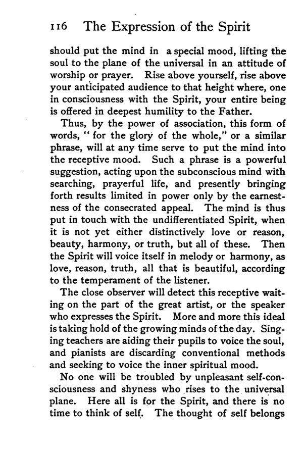 Thus, by the power of association, this form of words, " for the glory of the whole," or a similar phrase, will at any time serve to put the mind into the receptive mood. Such a phrase is a powerful suggestion, acting upon the subconscious mind with searching, prayerful life, and presently bringing forth results limited in power only by the earnestness of the consecrated appeal. The mind is thus put in touch with the undifferentiated Spirit, when it is not yet either distinctively love or reason, beauty, harmony, or truth, but all of these. Then the Spirit will voice itself in melody or harmony, as love, reason, truth, all that is beautiful, according to the temperament of the listener.