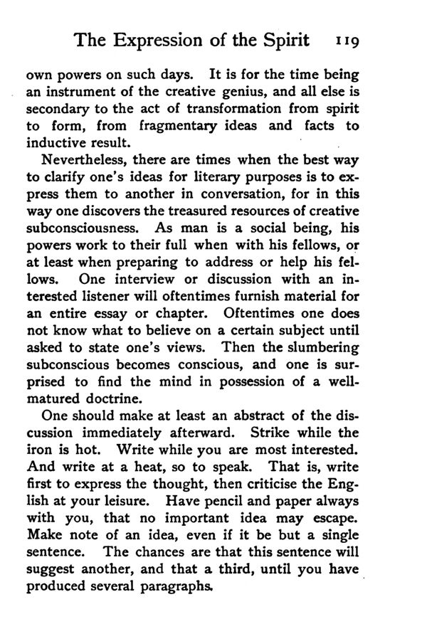 Nevertheless, there are times when the best way to clarify one's ideas for literary purposes is to express them to another in conversation, for in this way one discovers the treasured resources of creative subconsciousness. As man is a social being, his powers work to their full when with his fellows, or at least when preparing to address or help his fellows. One interview or discussion with an interested listener will oftentimes furnish material for an entire essay or chapter. Oftentimes one does not know what to believe on a certain subject until asked to state one's views. Then the slumbering subconscious becomes conscious, and one is surprised to find the mind in possession of a well matured doctrine.