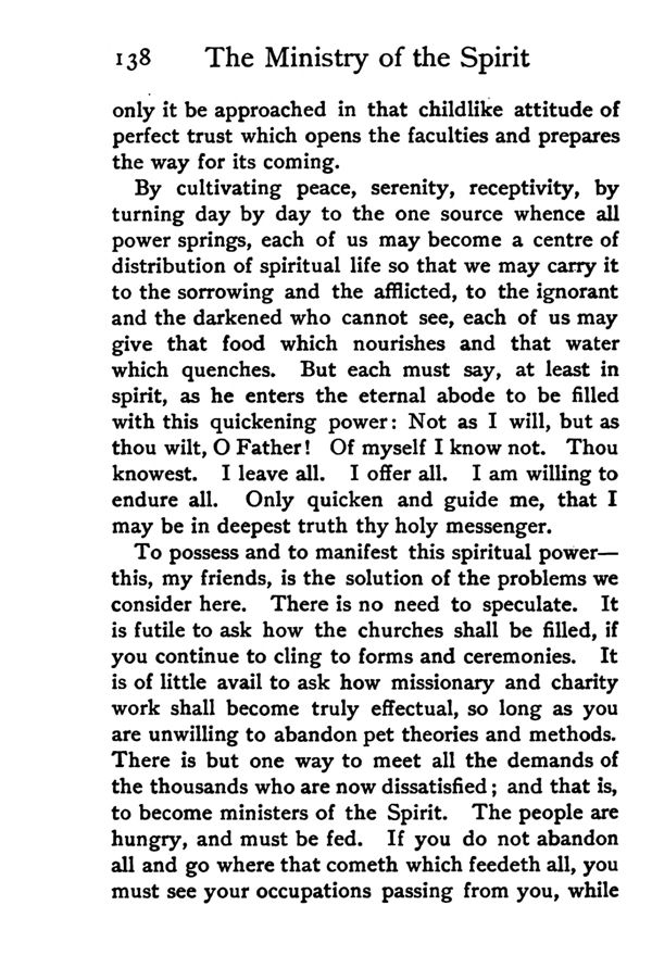 To possess and to manifest this spiritual power— this, my friends, is the solution of the problems we consider here. There is no need to speculate. It is futile to ask how the churches shall be filled, if you continue to cling to forms and ceremonies. It is of little avail to ask how missionary and charity work shall become truly effectual, so long as you are unwilling to abandon pet theories and methods. There is but one way to meet all the demands of the thousands who are now dissatisfied; and that is, to become ministers of the Spirit. The people are hungry, and must be fed. If you do not abandon all and go where that cometh which feedeth all, you must see your occupations passing from you, while