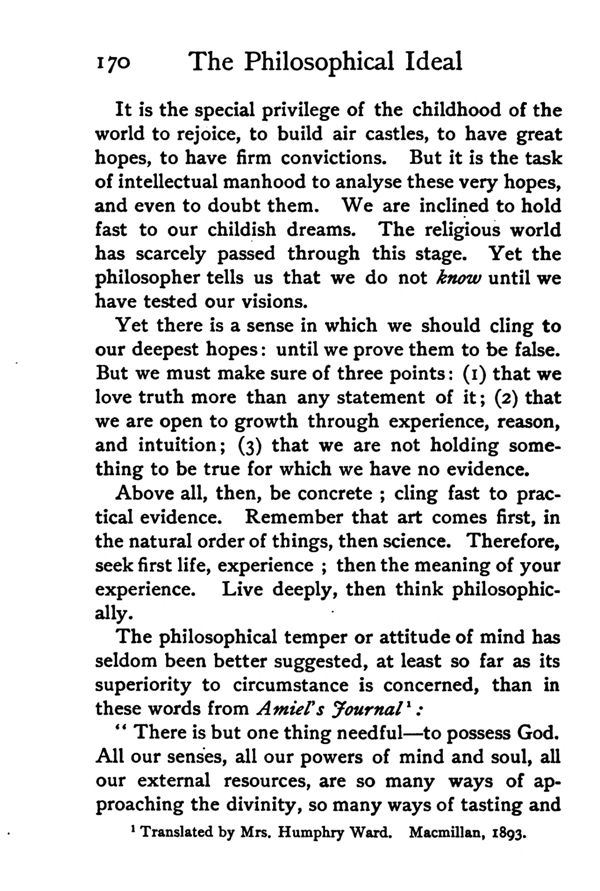 It is the special privilege of the childhood of the world to rejoice, to build air castles, to have great hopes, to have firm convictions. But it is the task of intellectual manhood to analyse these very hopes, and even to doubt them. We are inclined to hold fast to our childish dreams. The religious world has scarcely passed through this stage. Yet the philosopher tells us that we do not know until we have tested our visions.
