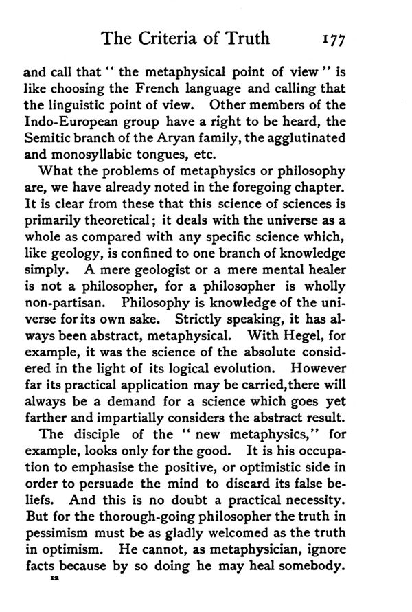 The disciple of the "new metaphysics," for example, looks only for the good. It is his occupation to emphasise the positive, or optimistic side in order to persuade the mind to discard its false beliefs. And this is no doubt a practical necessity. But for the thorough-going philosopher the truth in pessimism most be as gladly welcomed as the truth in optimism. He cannot, as metaphysician, ignore facts because by so doing he may heal somebody.