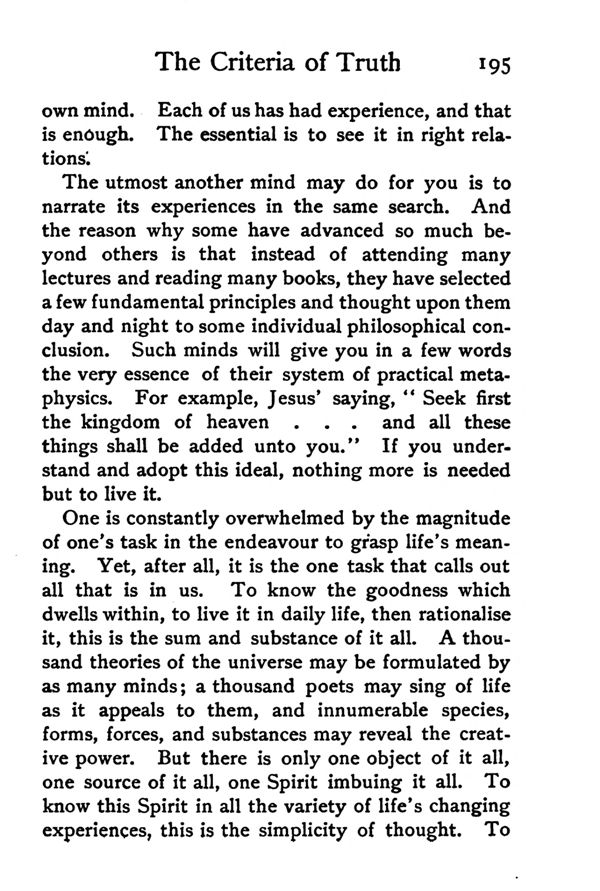 The utmost another mind may do for you is to narrate its experiences in the same search. And the reason why some have advanced an much beyond others is that instead of attending many lectures and reading many books, they have selected a few fundamental principles and thought upon them day and night to some individual philosophical conclusion. Such minds will give you in a few words the very essence of their system of practical metaphysics. For example, Jesus' saying, "Seek first the kingdom of heaven . . . and all these things shall be added unto you." If you understand and adopt this ideal, nothing more is needed but to live it.