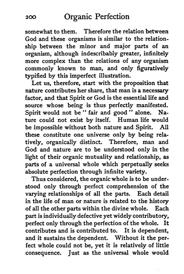 Thus considered, the organic whole is to be understood only through perfect comprehension of the varying relationships of all the parts. Each detail in the life of man or nature is related to the history of all the other parts within the divine whole. Each part is individually defective yet widely contributory, perfect only through the perfection of the whole. It contributes and is contributed to. It is dependent, and it sustains the dependent. Without it the perfect whole could not be, yet it is relatively of little consequence. Just as the universal whole would