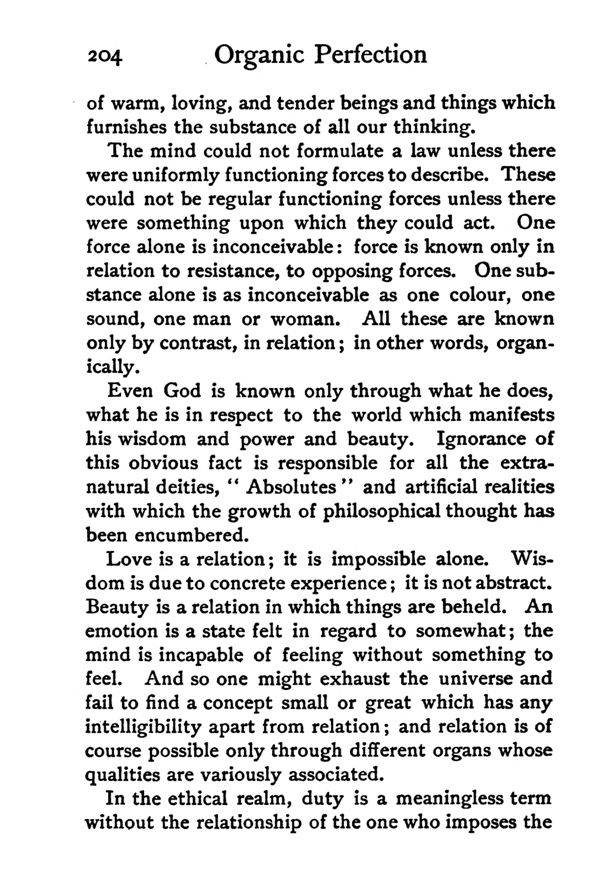 Love is a relation; it is impossible alone. Wisdom is due to concrete experience; it is not abstract. Beauty is a relation in which things are beheld. An emotion is a state felt in regard to somewhat; the mind is incapable of feeling without something to feel. And so one might exhaust the universe and fail to find a concept small or great which has any intelligibility apart from relation; and relation is of course possible only through different organs whose qualities are variously associated.