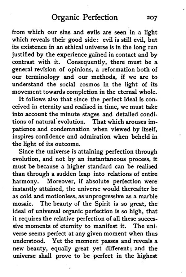 Since the universe is attaining perfection through evolution, and not by an instantaneous process, it must be because a higher standard can be realised than through a sudden leap into relations of entire harmony. Moreover, if absolute perfection were instantly attained, the universe would thereafter be as cold and motionless, as unprogressive as a marble mosaic. The beauty of the Spirit is so great, the ideal of universal organic perfection is so high, that it requires the relative perfection of all these successive moments of eternity to manifest it. The universe seems perfect at any given moment when thus understood. Yet the moment passes and reveals a new beauty, equally great yet different; and the universe shall prove to be perfect in the highest