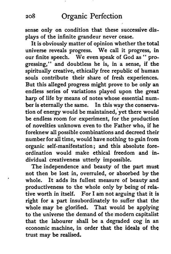 The independence and beauty of the part must not then be lost in overruled, or absorbed by the whole. It adds its fullest measure of beauty and productiveness to the whole only by being of relative worth in itself. For I am not arguing that it is right for a part insubordinately to suffer that the whole may be glorified. That would be applying to the universe the demand of the modern capitalist that the labourer shall be a degraded cog in an economic machine, in order that the ideals of the trust may be realised.