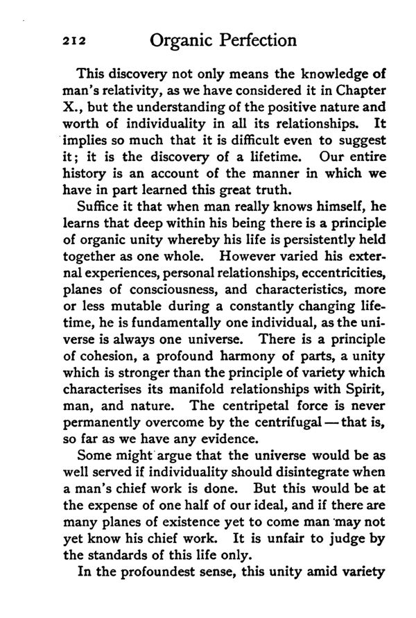 Suffice it that when man really knows himself, he learns that deep within his being there is a principle of organic unity whereby his life is persistently held together as one whole. However varied his external experiences, personal relationships, eccentricities, planes of consciousness, and characteristics, more or less mutable during a constantly changing lifetime, he is fundamentally one individual, as the universe is always one universe. There is a principle of cohesion, a profound harmony of parts, a unity which is stronger than the principle of variety which characterises its manifold relationships with Spirit, man, and nature. The centripetal force is never permanently overcome by the centrifugal—that is, so far as we have any evidence.