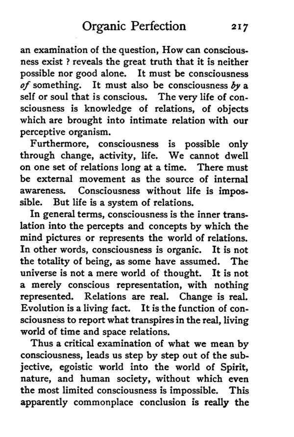 an examination of the question, How can consciousness exist? reveals the great truth that it is neither possible nor good alone. It most be consciousness of something. It most also be consciousness by a self or soul that is conscious. The very life of consciousness is knowledge of relations, of objects which are brought into intimate relation with our perceptive organism.
