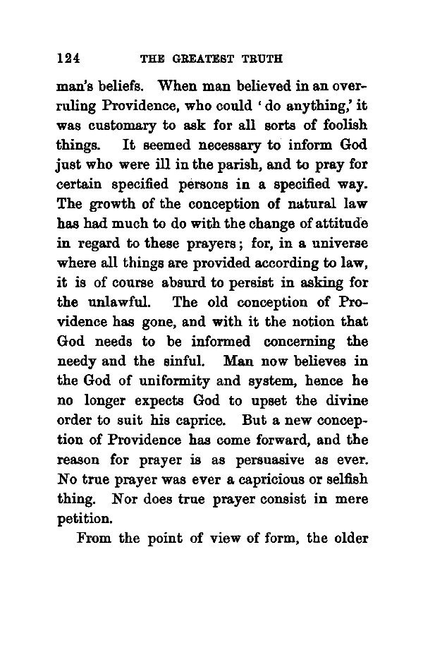 man's beliefs. When man believed in an over- ruling Providence, who could ' do anything,' it was customary to ask for all sorts of foolish things. It seemed necessary to inform God just who were ill in the parish, and to pray for certain specified persons in a specified way. The growth of the conception of natural law has had much to do with the change of attitude in regard to these prayers , for, in a universe where all things are provided according to law, it is of course absurd to persist in asking for the unlawful. The old conception of Providence has gone, and with it the notion that God needs to be informed concerning the needy and the sinful. Man now believes in the God of uniformity and system, hence he no longer expects God to upset the divine order to suit his caprice. But a new conception of Providence has come forward, and the reason for prayer is as persuasive as ever. No true prayer was ever a capricious or selfish thing. Nor does true prayer consist in mere petition. From the point of view of form, the older