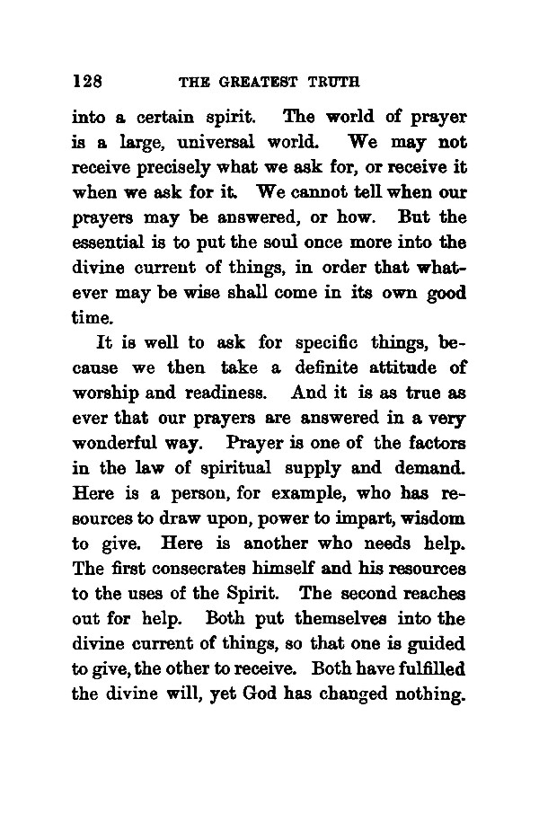 into a certain spirit. The world of prayer is a large, universal world. We may not receive precisely what we ask for, or receive it when we ask for it. We cannot tell when our prayers may be answered, or how. But the essential is to put the soul once more into the divine current of things, in order that whatever may be wise shall come in its own good time. It is well to ask for specific things, because we then take a definite attitude of worship and readiness. And it is as true as ever that our prayers are answered in a very wonderful way. Prayer is one of the factors in the law of spiritual supply and demand. Here is a person, for example, who has resources to draw upon, power to impart, wisdom to give. Here is another who needs help. The first consecrates himself and his resources to the uses of the Spirit. The second reaches out for help. Both put themselves into the divine current of things, so that one is guided to give, the other to receive. Both have fulfilled the divine will, yet God has changed nothing.