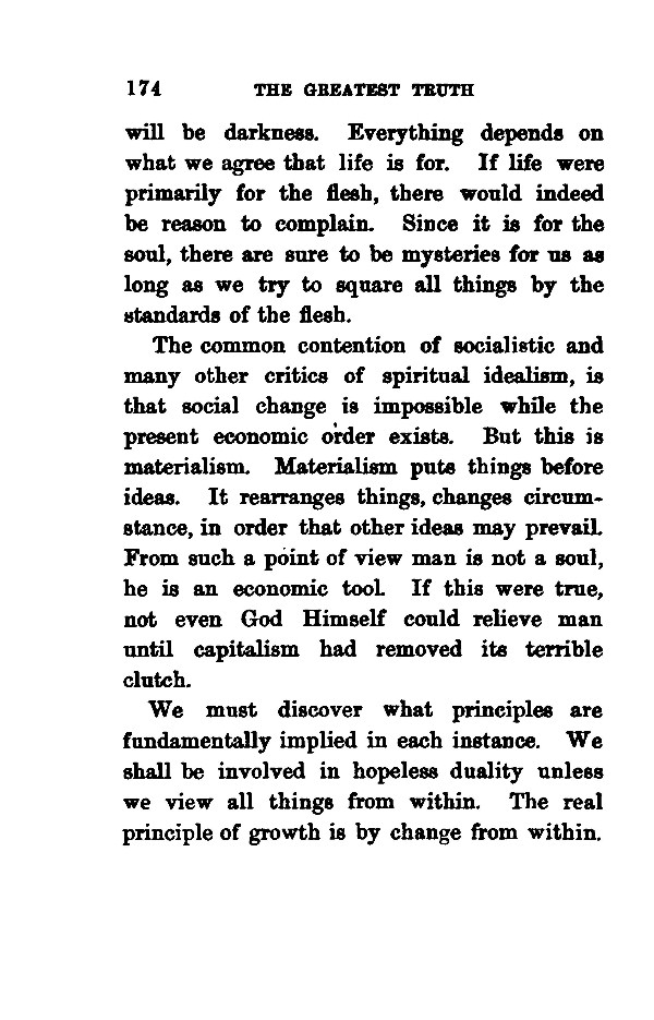 will be darkness. Everything depends on what we agree that life is for. If life were primarily for the flesh, there would indeed be reason to complain. Since it is for the soul, there are sure to be mysteries for us as long as we try to square all things by the standards of the flesh. The common contention of socialistic and many other critics of spiritual idealism, is that social change is impossible while the present economic order exists. But this is materialism. Materialism puts things before ideas. It rearranges things, changes circumstance, in order that other ideas may prevail. From such a point of view man is not a soul, he is an economic tool If this were true, not even God Himself could relieve man until capitalism had removed its terrible clutch. We must discover what principles are fundamentally implied in each instance. We shall be involved in hopeless duality unless we view all things from within. The real principle of growth is by change from within.