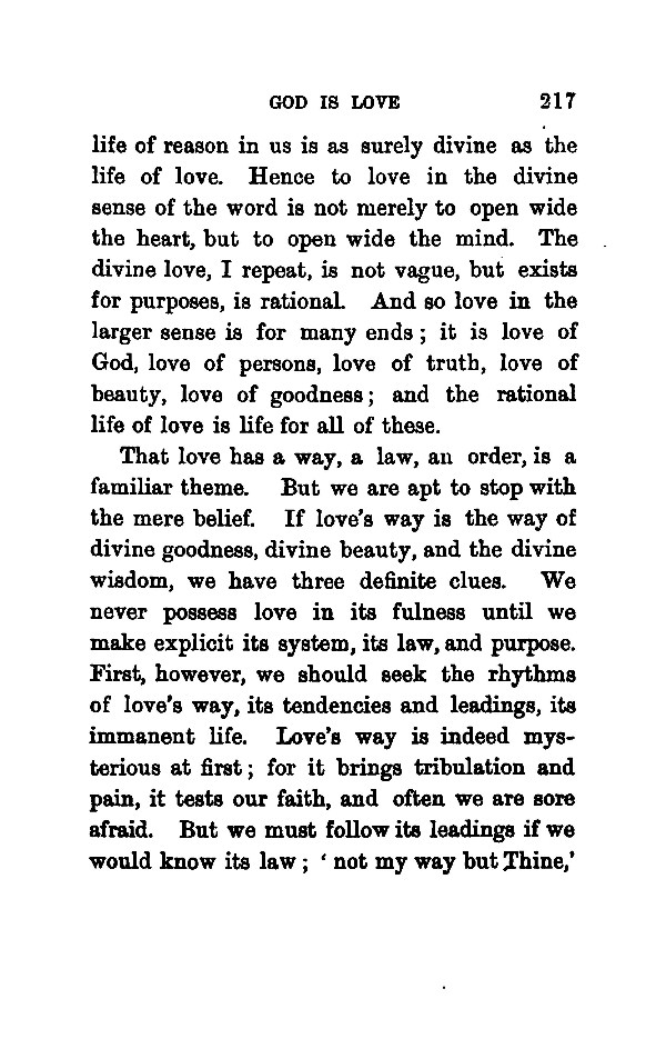 life of reason in us is as surely divine as the life of love. Hence to love in the divine sense of the word is not merely to open wide the heart, but to open wide the mind. The divine love, I repeat, is not vague, but exists for purposes, is rational. And so love in the larger sense is for many ends; it is love of God, love of persons, love of truth, love of beauty, love of goodness; and the rational life of love is life for all of these. That love has a way, a law, an order, is a familiar theme. But we are apt to stop with the mere belief. If love's way is the way of divine goodness, divine beauty, and the divine wisdom, we have three definite clues. We never possess love in its fulness until we make explicit its system, its law, and purpose. First, however, we should seek the rhythms of love's way, its tendencies and leadings, its immanent life. Love's way is indeed mysterious at first; for it brings tribulation and pain, it tests our faith, and often we are sore afraid. But we must follow its leadings if we would know its law; ' not my way but Thine,'